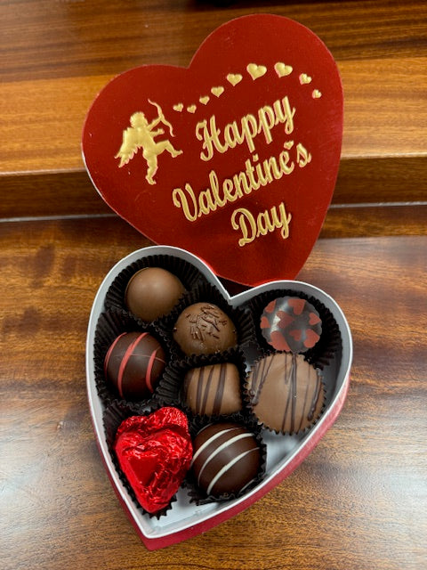 Classic heart shaped box adorn with a red ribbon is filled with caramels, creams, peanut butter cup, and an artisan truffle.